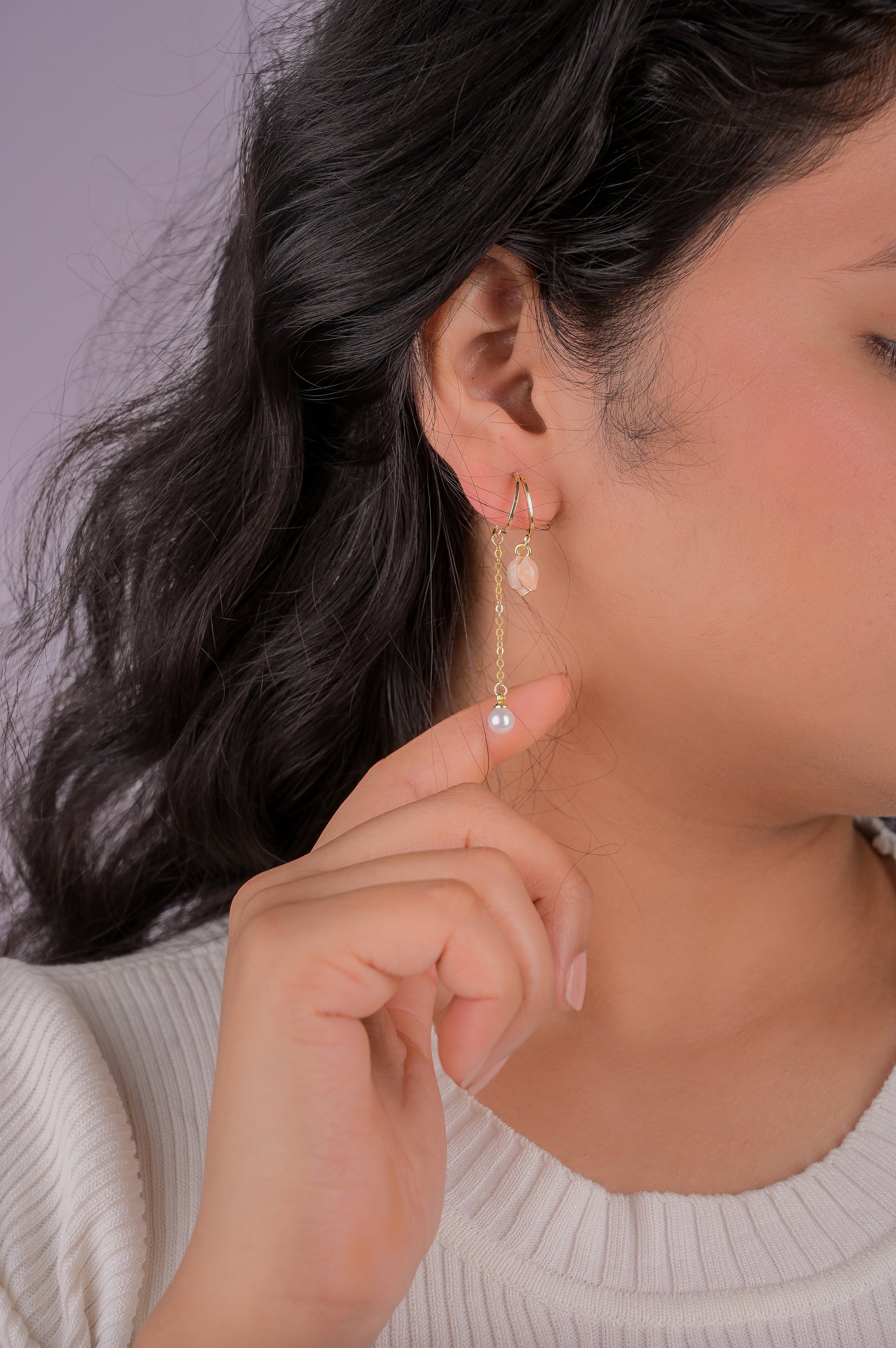 A soft pop of romance, Kara’s Blush Rose Drop Earrings feature a delicate pink rose with a fine pearl-draped chain. Finished in anti-tarnish gold, they’re a poetic piece for dreamers.